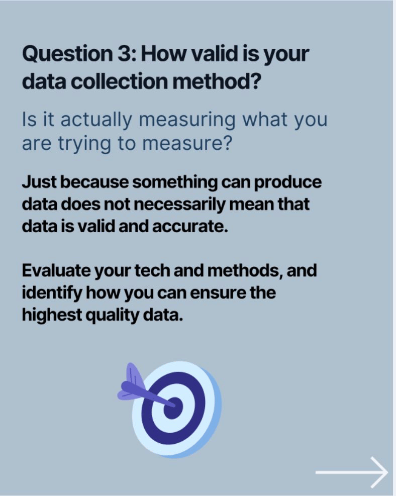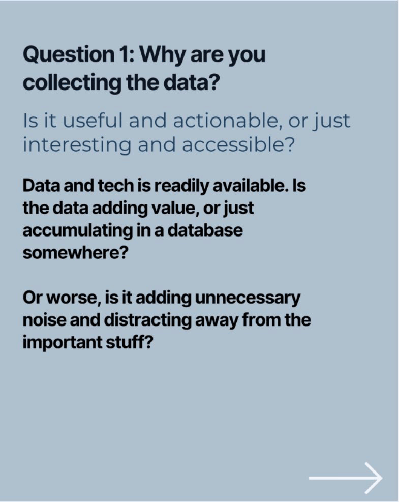 A common issue I see is using data/tech because you can and the data it produces are interesting. But accessible and interesting does not necessarily mean it will be useful and actionable. More is not always better if it distracts you from what matters most or sends you down the wrong path because you do not have a plan for how to use it. At best, I often see this data just accumulating in a database with no clear use.