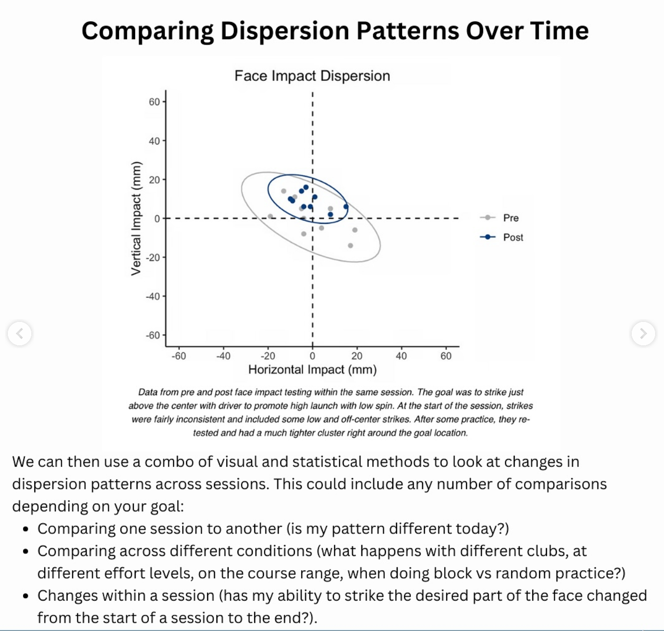 An example of creating a dispersion pattern from face impact data (where on the club face each shot is struck). I prefer dispersions in this case because it shows your overall patterns across multiple shots rather than just focusing on individual shots or the average position. There are then statistical methods you can use to see how much it changed, though even a visual inspection can be useful. Excerpt from this post: https://www.instagram.com/p/DIORxEBuHnu/?img_index=1