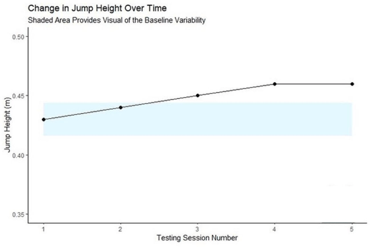 A simple example of using the standard deviation of jump height at baseline to set a threshold for what would be a “real change.” In this case, the blue shaded region is the first data point plus and minus the standard deviation of the test. The second data point increased, but not beyond the variability of the test, so I would interpret this a bit cautiously. But by the 3rd testing session, the increase is large enough to be more confident it is a “real change.”