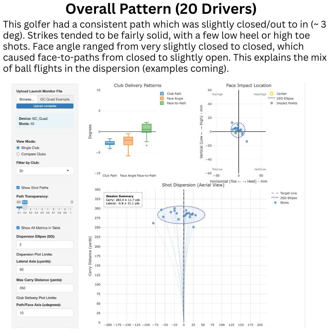 Let’s go through a few examples from a dataset of 20 driver swings. Keep in mind that I’m showing screenshots of just the visuals, but there’s also a table at the bottom that allows me to see the full array of metrics to provide additional context to each shot and the patterns as a whole (e.g., clubhead speed, ball speed, launch angle, spin rate, etc.).