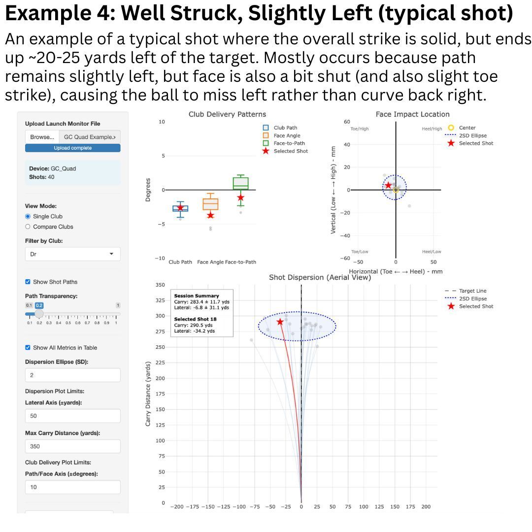 In this case, the ball ends up ~22 yards right of the target, but again with decent distance. The strike is good on this one. But what we see is a fade that’s pretty neutral, creating a fairly positive face-to-path.